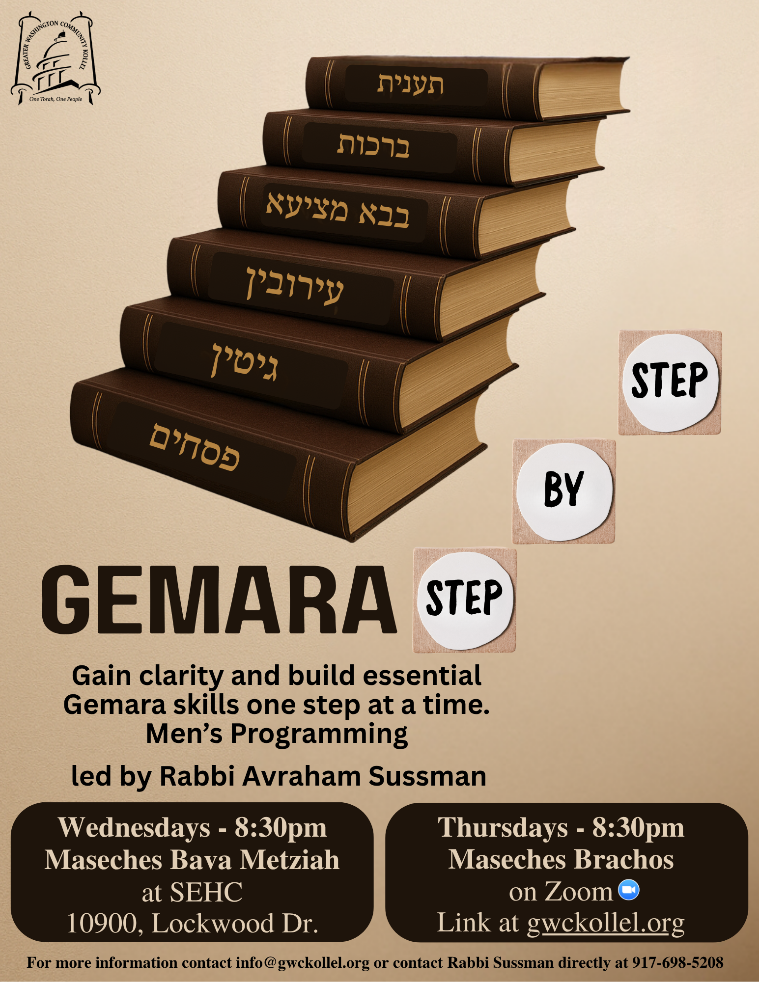 For Men - 8:30pm - Gemara Step by Step - Rabbi A. SussmanOnline: https://zoom.us/j/8033564156 Password: Learn Dial-in number: 301-715-8592 Meeting ID: 803 356 4156