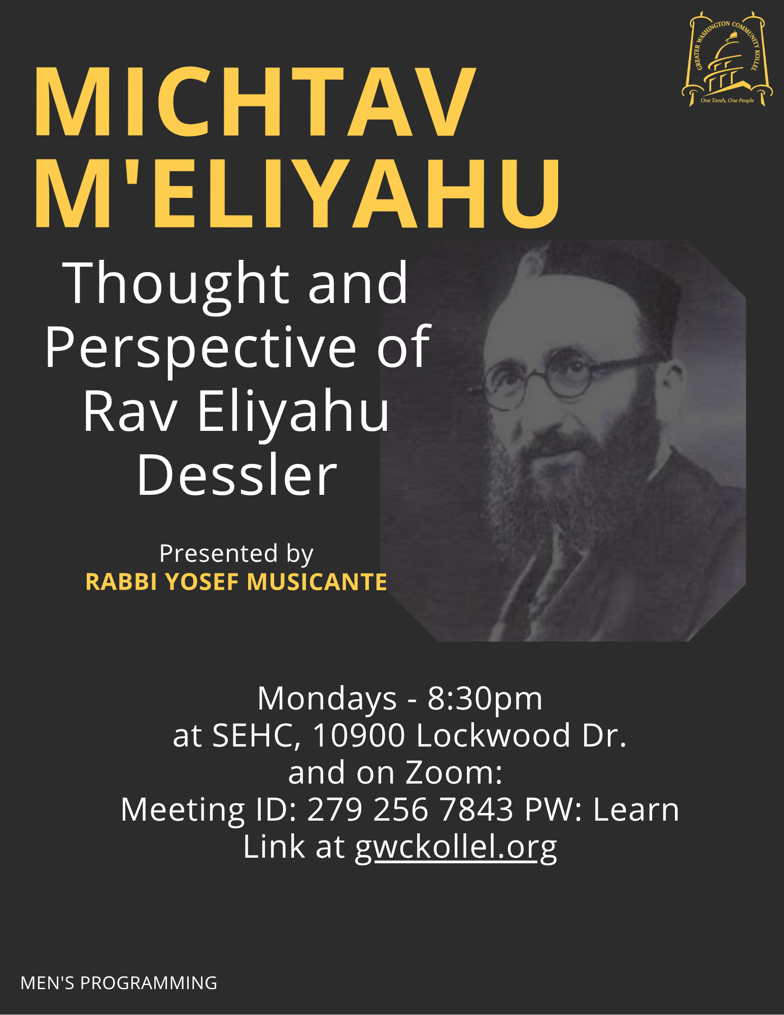 8:30pm - Michtav M'Eliyahu - Rabbi Y. MusicanteOnline: https://zoom.us/j/2792567843 Password: Learn Dial-in number: 301-715-8592 Meeting ID: 279 256 7843
