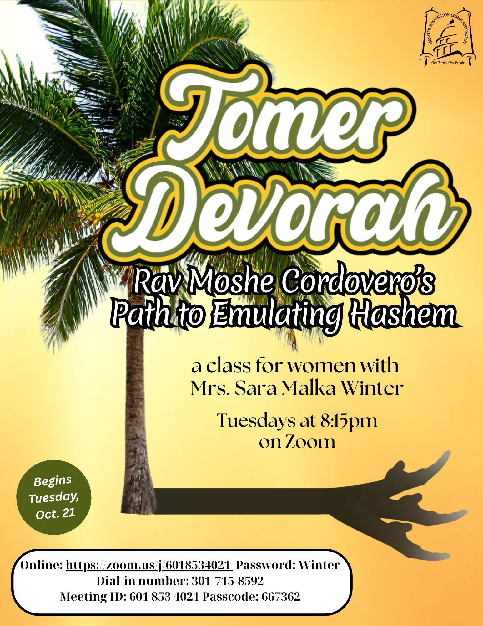 For Women - 8:15pm - Tomer Devorah - Mrs. S.M. WinterOnline: https://zoom.us/j/6018534021 Password: Winter Dial-in number: 301-715-8592 Meeting ID: 601 853 4021 Telephone Passcode: 667362